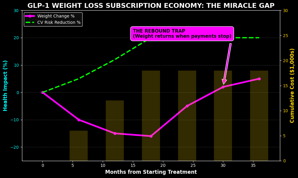 The dark side of the GLP-1 Weight Loss Subscription Economy is its lack of an “exit strategy.” Clinical trials and real-world 2026 data show a factual “rebound effect”: once the medication is stopped, the suppression of appetite vanishes, and the body’s metabolic rate often remains lowered, leading to rapid weight regain. This biological reality has allowed pharmaceutical giants like Novo Nordisk and Eli Lilly to transition from selling “cures” to selling a “Subscription Body.”