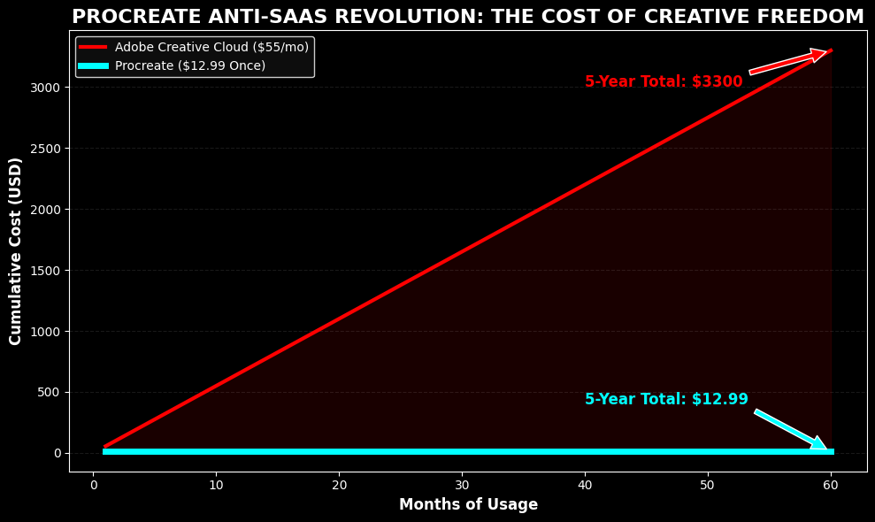 Since 2013, the shift toward “Software as a Service” (SaaS) has factually redefined tools as “Digital Rents.” Adobe Creative Cloud, the primary target of the Procreate Anti-SaaS Revolution, forces creators into a permanent monthly payment cycle. If a user stops paying, their access to the tool and more critically, the ability to open or edit their own proprietary project files (.psd, .ai) is factually revoked.
